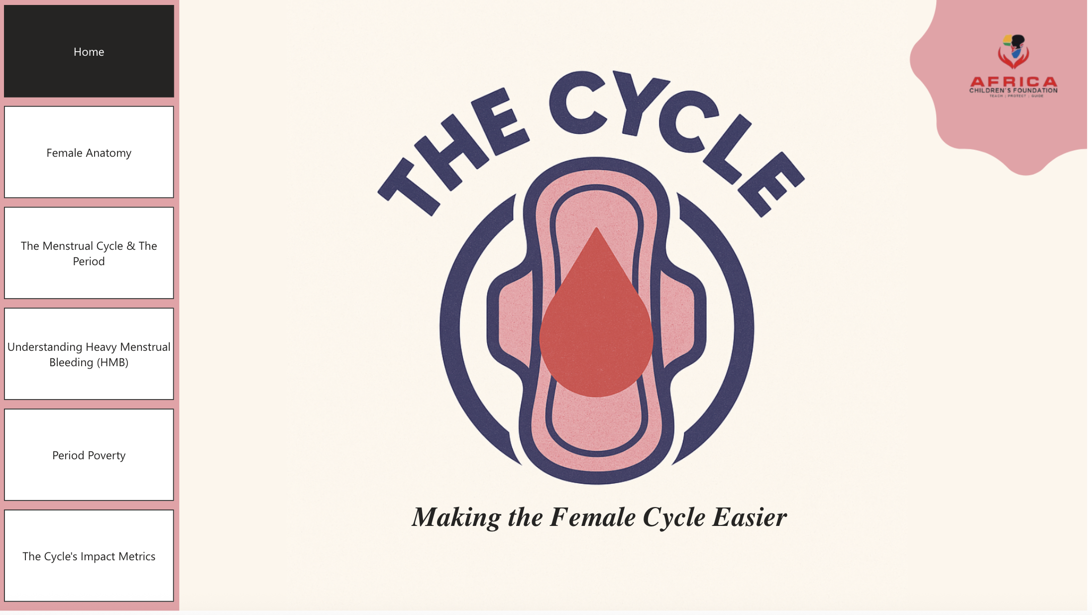The Cycle Project, an initiative of the Africa Children's Foundation, aims to combat period poverty among adolescent girls and women in impoverished African countries. Through the distribution of sustainable menstrual hygiene kits and educational programs, The Cycle empowers young girls by reducing the health risks associated with poor menstrual hygiene, increasing school attendance, and breaking taboos around menstruation. The project is a menstrual program to bring awareness to the disparities that exist in women’s health and how they affect adolescent girls in Africa. With this project, we aim to provide young girls with the tools and resources they need to take control of their health and femininity, making the female cycle as comfortable as possible.
